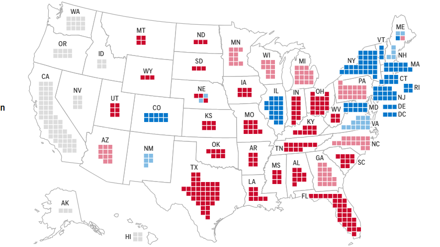 其它6個搖擺州,特朗普拿下了北卡羅來納,另外在威斯康辛、密歇根、喬治亞和賓夕法尼亞也領先,哈里斯則在亞利桑那領先。