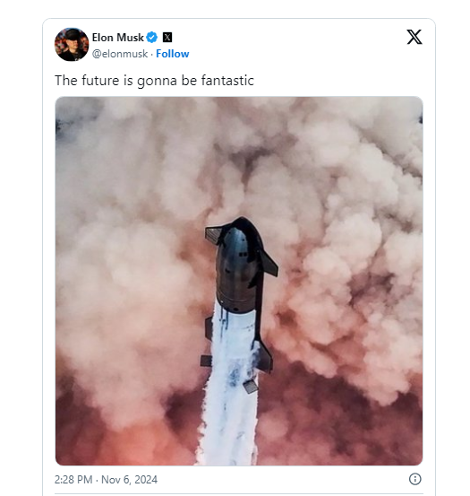 馬斯克還在社群平臺X上PO出一張火箭噴射照,表示“未來將會是美好的”,并分享一張圖表,顯示了X在美國每小時的行動使用量,從早上5點開始急劇增加,到晚上11點達到每小時60億秒的最高峰,強調在美國大選日當天X平臺的使用量創下歷史新高。