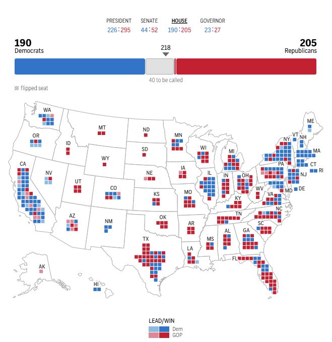 據美聯社的統計,至今日清晨,共和黨已取得眾議院205席,民主黨取得190席,要獲得控制權需取得過半數的218席(眾議院共有435個議席)。