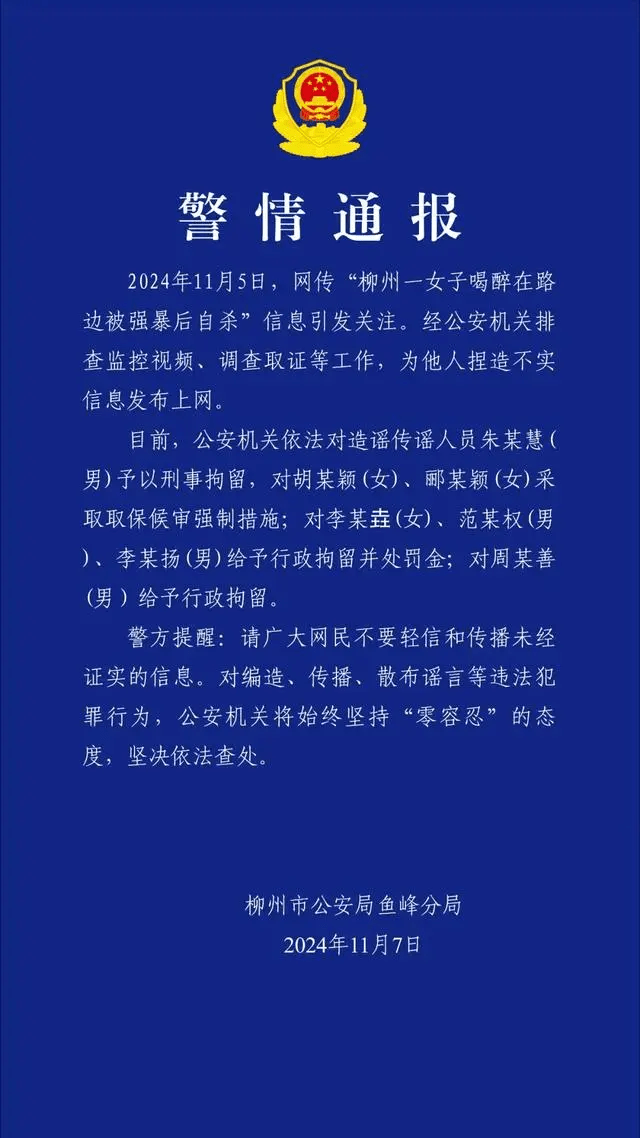 在廣西柳州,近日網傳“一女子喝醉在路邊被性侵后自殺”,相關的影片在網上瘋傳,事件引發關注。事后警方介入調查,7人被處罰,其中1人被刑拘,稱這對男女其實是朋友關系,網上消息屬于謠言。