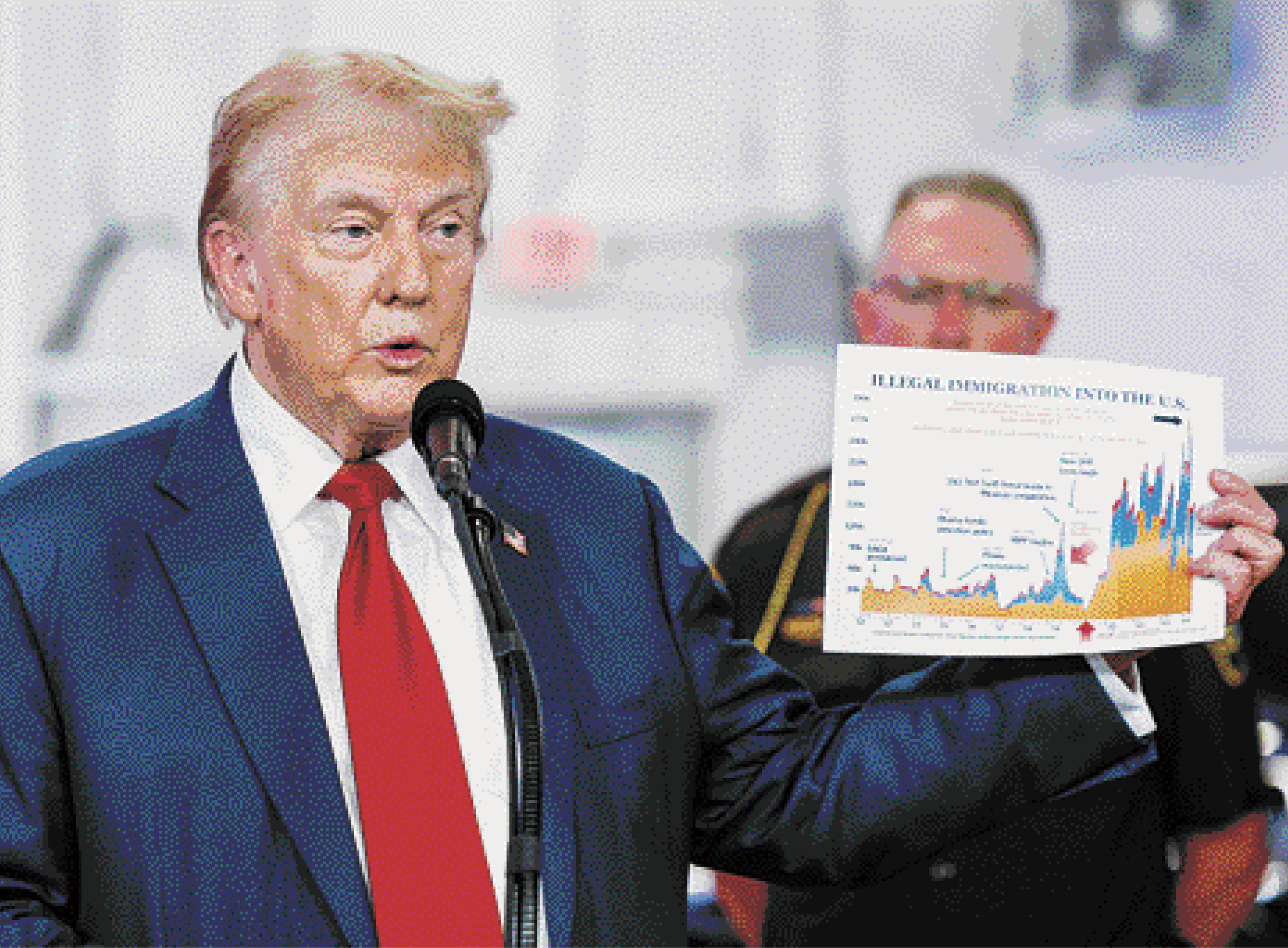 ▲候任總統特朗普宣稱明年接任后的首要任務之一就是解決非法移民問題。圖為他訪問密歇根州豪厄爾市利文斯頓縣治安官辦公室時,手拿一張有關非法移民美國的圖表。 路透社資料圖片