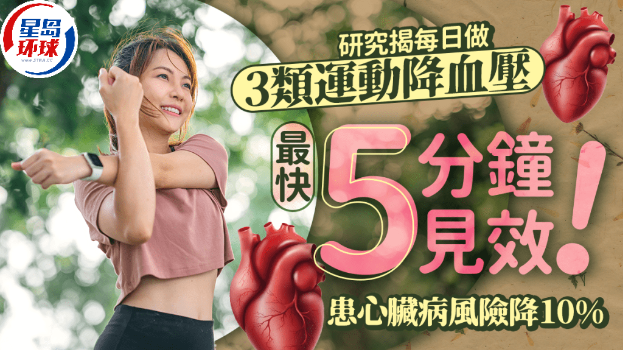 做運動有助降血壓,哪種運動最有效?外國一項涉及逾1.4萬人的最新研究發現,有3類運動只需每日做至少5分鐘,即可有助降血壓,患心臟病風險更可降10%。