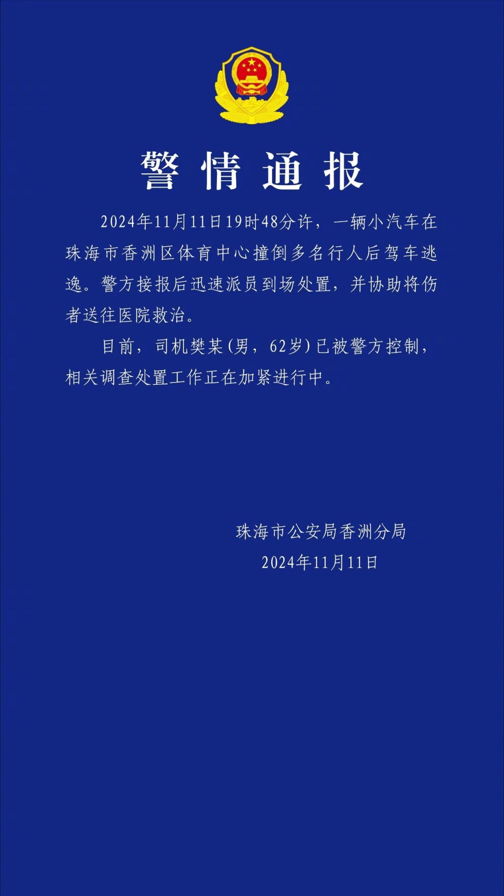 內地網絡消息指,周一晚上,珠海體育中心附近道路有車輛亂撞途人,多名傷者倒地。官方通報指,涉事62歲男司機被捕。隨后事發時車輛撞人的影片曝光,可見越野車前有人群逃避,拍片者更爆粗稱“撞死好多人啊”。