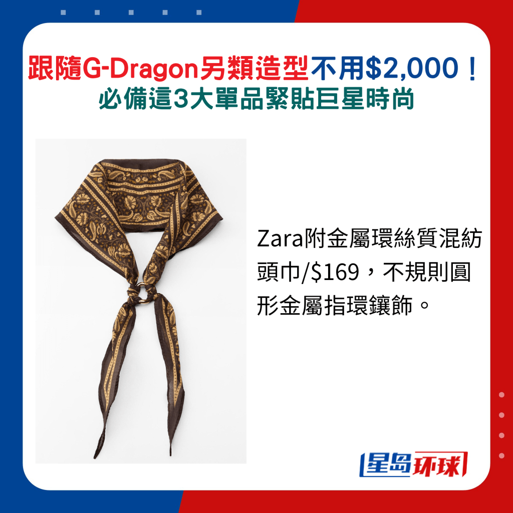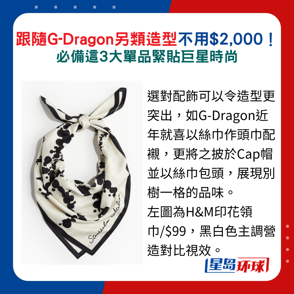 選對配飾可以令造型更突出,如G-Dragon近年就喜以絲巾作頭巾配襯,更將之披于Cap帽并以絲巾包頭,展現別樹一格的品味。 同樣地,大眾化價錢都有選擇,如快速時尚品牌H&M及Zara,前者的黑白色印花圖案絲巾,兼備頭飾與肩飾,后者的頭巾則配以金屬環裝飾,方便靈活配搭。 除了以上之外,想找售價親民的Chain Bag,Charles & Keith新登場的Apfra黑色菱格紋手袋包羅大型號及手挽款式,可迎合不同造型穿搭及場合需要。