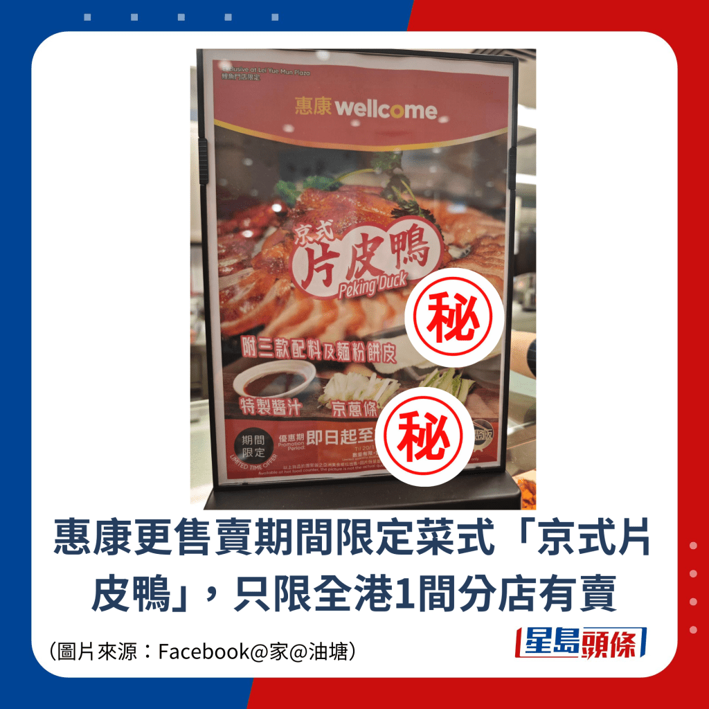 惠康更售賣期間限定菜式“京式片皮鴨”,只限全港1間分店有賣