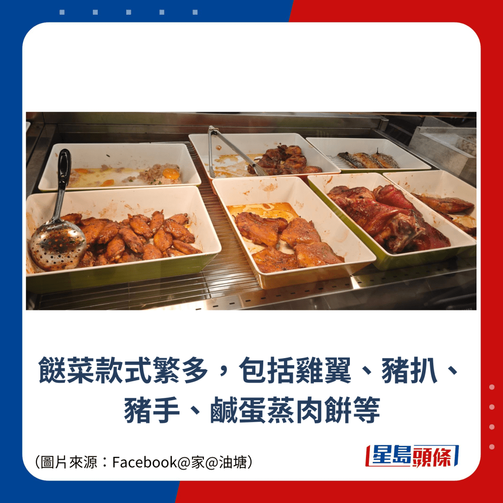 餸菜款式繁多,包括雞翼、豬扒、豬手、咸蛋蒸肉餠等