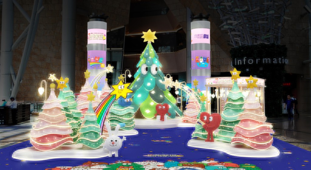 朗豪坊今年圣誕聯乘國際藝術家Nina Dzyvulska,以其充滿玩味的標志性愛心角色,打造“抱抱圣誕LOVE LOVE LOVE”藝術企劃,鼓勵大家以抱抱及愛心傳達愛意。 Nina以旺角為靈感,設計精美藝術插畫,利用街頭小食、街道、紅van的社區印象融入畫作。 Nina設計的愛心大型裝置將設置于4樓通天廣場,更豎立7米高、擁有發光大眼睛的毛茸茸圣誕樹!
