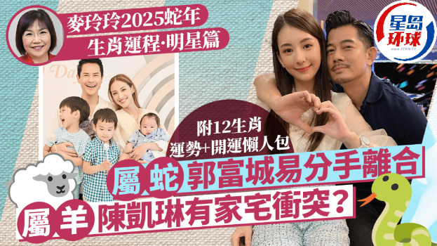 【麥玲玲蛇年生肖運程】2025蛇年生肖運程,麥玲玲師傅為大家分享吉星兇星開運貼士!除了要留意自己的生肖有否犯太歲,或是犯哪一種太歲外,亦要留意今年的吉星及兇星?!缎菎u》集合麥玲玲師傅2025蛇年運程分析,看看哪些藝人明星新一年行好運?又有哪位犯太歲?并附上12生肖蛇年開運錦囊。即睇麥玲玲2025蛇年生肖運程上集,包括屬蛇、屬馬、屬羊、屬猴、屬雞及屬狗的明星藝人及名人運程及各12生肖開運方法。