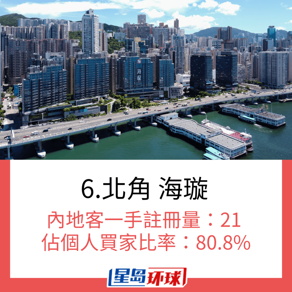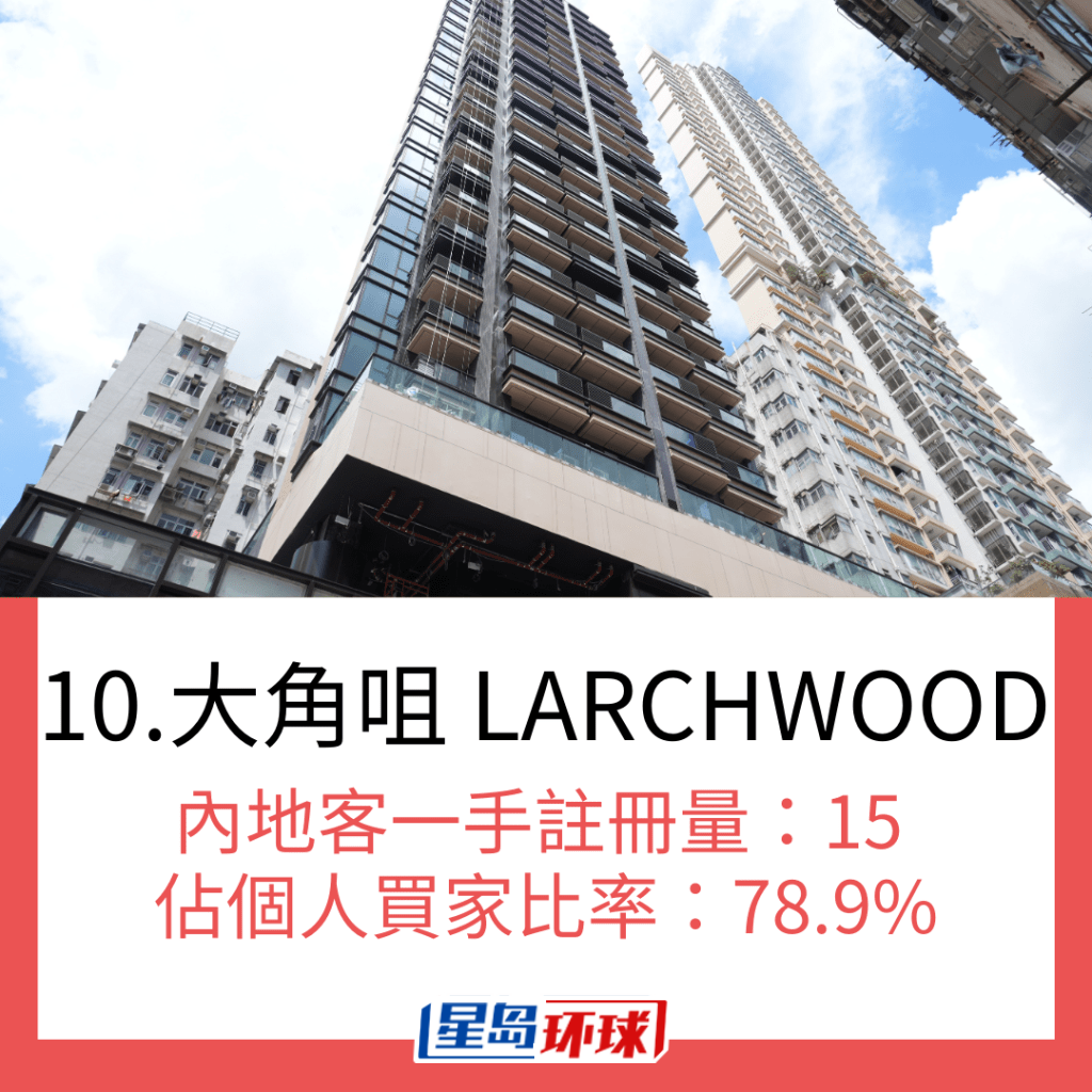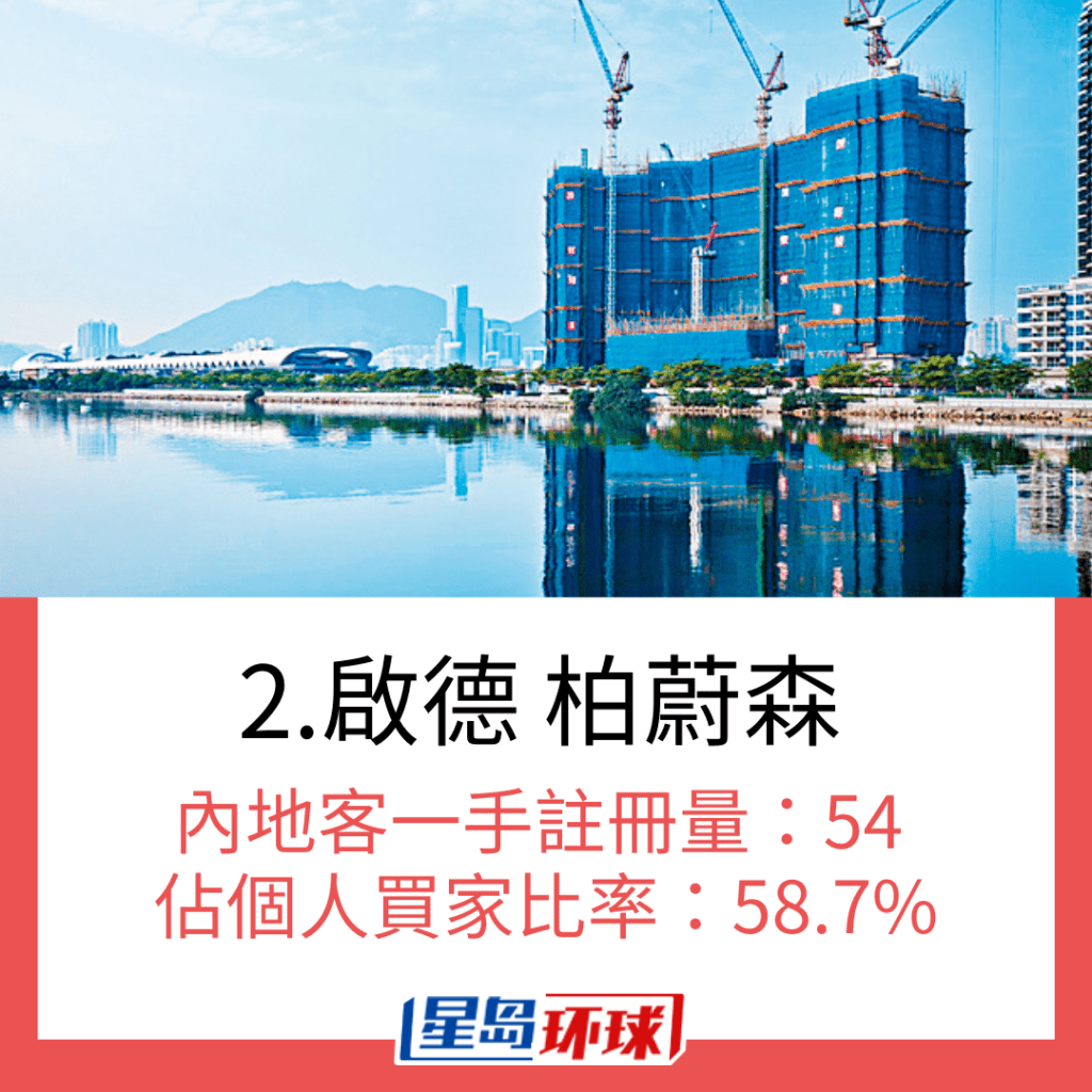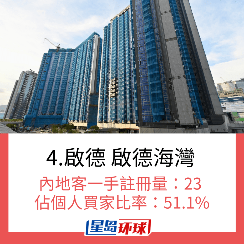 若以10月一手私宅注冊量最多內地買家的首10個新盤計算,當中最多內地買家選購的新盤是啟德天璽. 天,月內錄119宗注冊登記,占該項目的個人買家約45.6%。 內地買家選購第二多的新盤是同樣位處啟德區的柏蔚森,月內錄54宗內地買家注冊登記,占比更達58.7%。 若以占比計算,北角海璇的內地買家一手私宅注冊量占比高達80.8%; 大角咀LARCHWOOD亦占約78.9%。