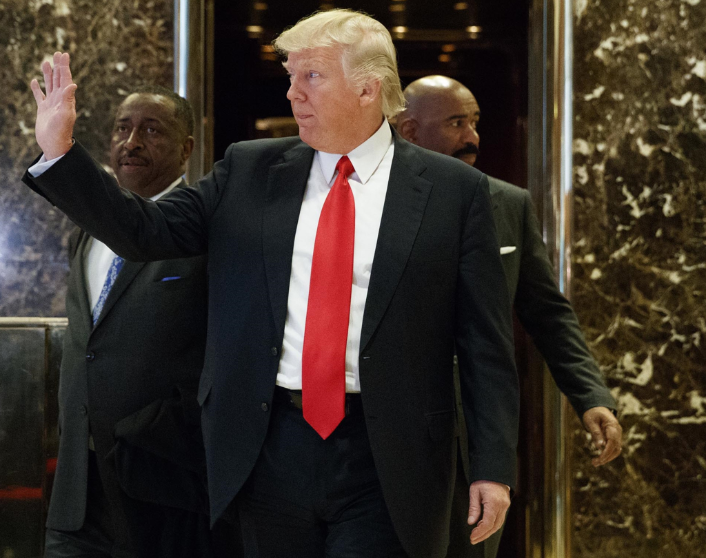 美國準總統特朗普迅速公布內閣名單,圖為他步出紐約特朗普大樓金碧輝煌的電梯,向在場人士揮手的資料照。