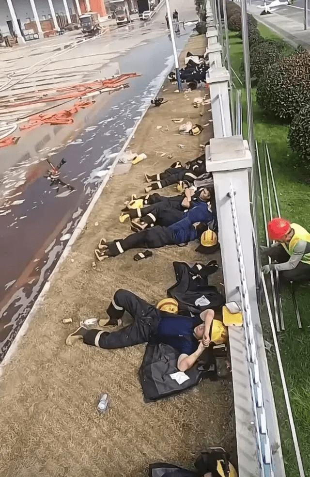 江蘇無錫京東物流園12日晚發生火災后,經過整晚的救火后消防員翌日躺地休息。微博