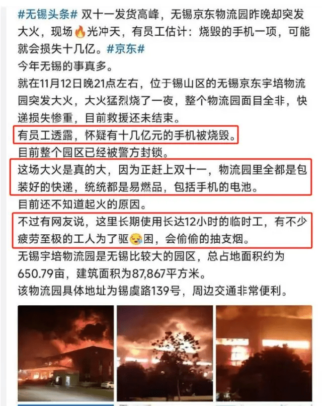 雙11購物節才剛結束,沒想到江蘇無錫的京東宇培物流園區,隔天發生大火,帶來的巨大的經濟損失,更讓許多消費者心急如焚,擔心自己的包裹可能被燒光,損失恐怕高達十幾億(人民幣,下同)。