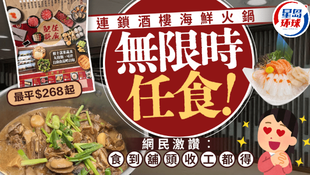 秋風起,吃貨族大嘆煲仔飯、臘味飯及蛇羹之外,還有火鍋! 在香港打邊爐,火鍋選擇既有日式海鮮火鍋放題,也有主打潮汕牛肉的火鍋,以及1人火鍋等多元化種類。 最近有網民在社交平臺分享光顧一間連鎖酒樓的海鮮火鍋放題,大贊“超級抵食”、“包埋飲品同啤酒任飲”,再加上“無限時”關系,直言:“由5:00食到收工都仲得”。