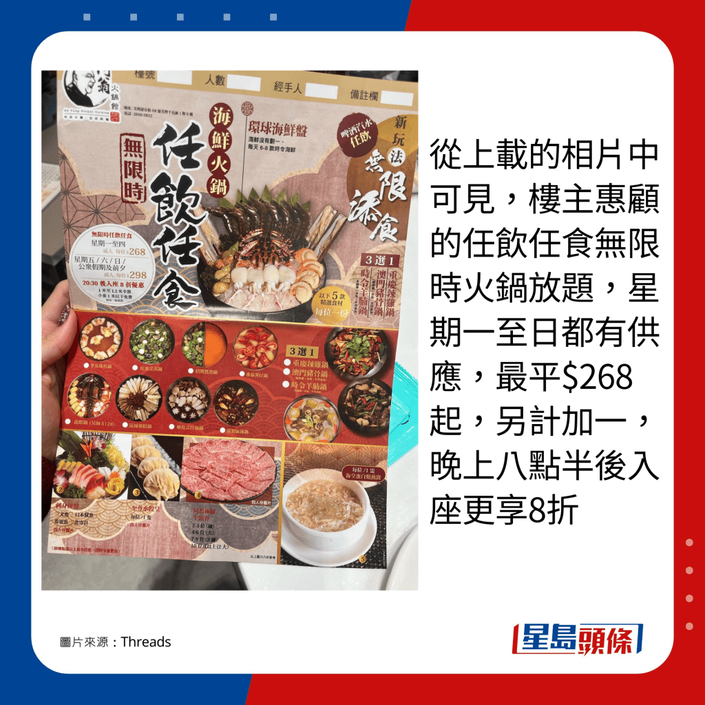 該位網民在Threads發帖,圖文并茂,跟網民分享是次在連鎖酒樓惠顧火鍋放題的愉快體驗。 文中甫開首道:“唔知道大家有冇食過,超級抵食”,接著樓主便指出,因為無限時的關系,可以“由5:00食收工都仲得”,而飲品及啤酒任飲之外,兼且“頭盤會送5樣野”。 從上載的相片中可見,樓主惠顧的任飲任食無限時火鍋放題,星期一至日都有供應,最平$268起,逾數十款丸類及蔬菜任食,更可獲贈刺身拼盤、水餃皇、牛頸脊及蛋白燴燕窩,惟要留意上述的4款食物會因時令作出更改。