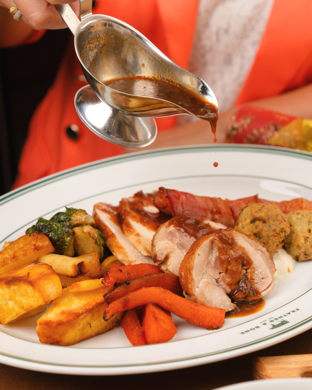 重點推介當然少不了經典的節日佳肴──傳統烤火雞,火雞經過新鮮香草等材料醃制,烤至外皮酥脆,肉質香嫩多汁,不會過硬或者過柴,配上蔬菜和煙肉卷及肉丸,更是解膩。想要吃得輕盈一點的,也可以選擇大西洋三文魚柳或南瓜意大利飯作為主菜。