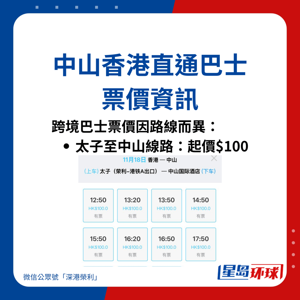 跨境巴士票價因路線而異,路線如太子前往中山,價錢由$100起跳;灣仔前往中山的話,價錢$110起;迪士尼樂園前往中山,價錢$220起等等。