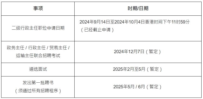 翌年2月至3月會舉行首輪面試;3月至4月會舉行最后面試;6月至7月會發出首批聘書(視乎所有招聘程序是否已經完成); 最后在7月至8月,首批新聘任政務主任入職。 以上資料只供參考。 所有事項的實際舉行時間及細節,請參閱當時的公布。