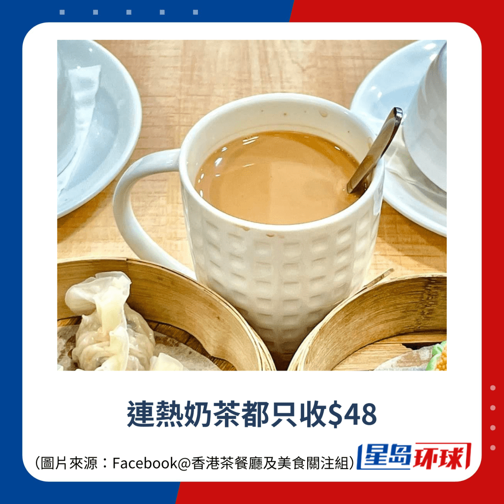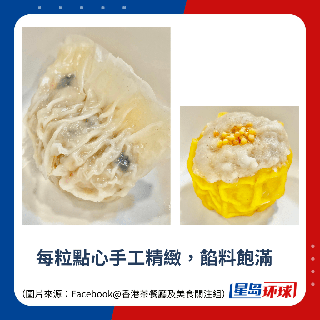 近日,有網民于社交平臺Facebook“香港茶餐廳及美食關注組”群組發文,分享佐敦廟街社企“慈悲香港食堂”最新推出的優惠價下午茶餐非常抵食!網民當天點了兩籠點心,包括燒賣及魚翅餃(每籠各3粒),連熱奶茶都只收$48。樓主大贊抵食,在帖文內形容“平過網絡酸民貧窮中位數(五十蚊)”。從樓主上載的圖片所見,每粒點心手工精致,餡料飽滿,餐廳環境簡約舒適,十分適合食客慢慢嘆茶、細味點心!