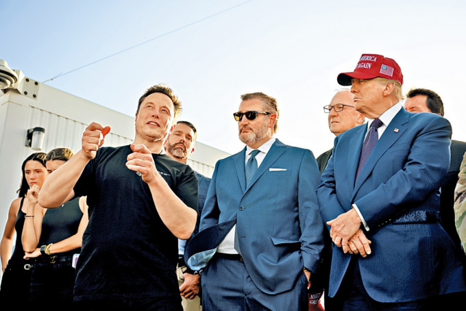 ▲火箭升空前,馬斯克向特朗普和參議員克魯茲(中)等人解說。