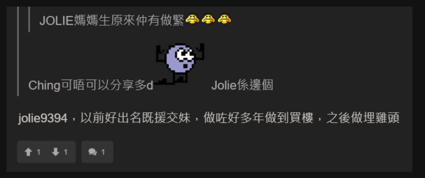 另據悉,賣淫集團主腦為一名37歲姓歐女子,她操控一個“Jolie and friends”Telegram群組,主要以“Jolie9394”網名示人,討論區不時有人提及,被稱為“JOLIE媽媽生”。