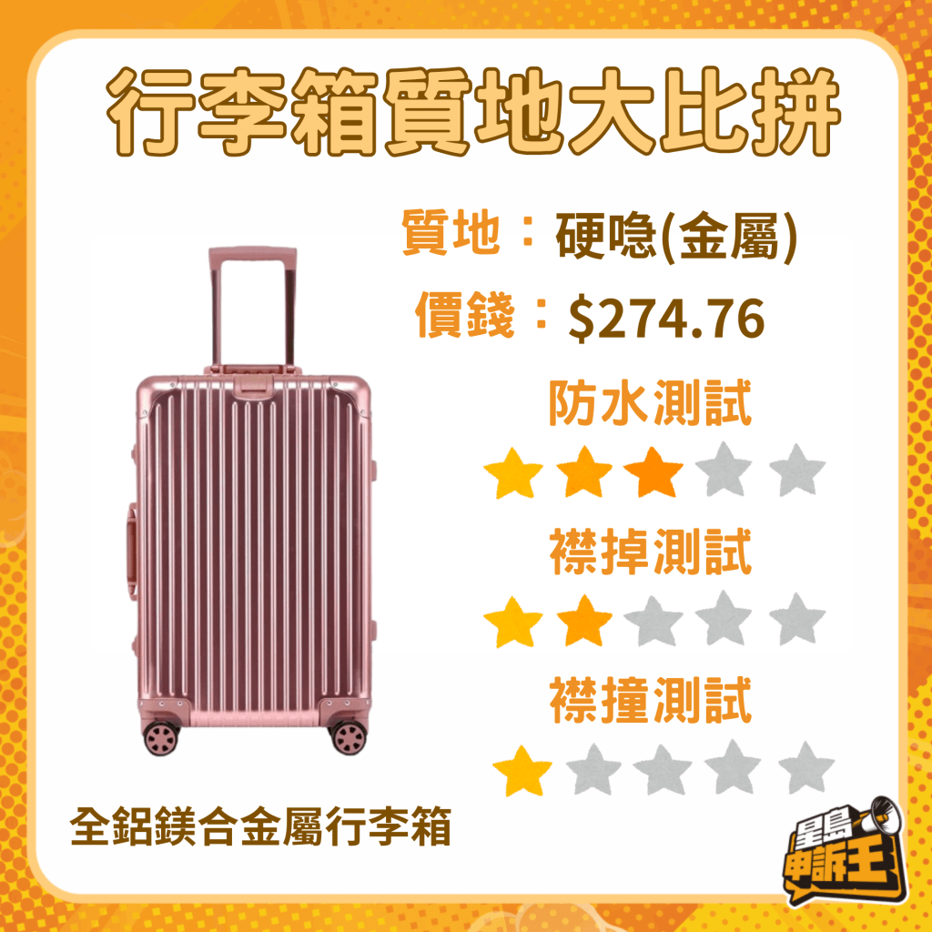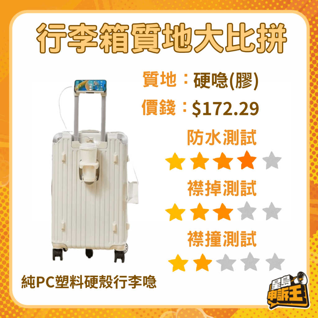 港人一向熱愛旅行,不少人家中至少有一個行李箱。市面上不乏價格高且標榜實用的行李箱,但亦有不少人傾向購買平價行李箱?!缎菎u申訴王》今次網購了3個不同質地,且價錢在300元或以下的20吋手提喼,物料包括布、膠及金屬箱,實測一它們的“襟撞”、“襟掉”及“防水”程度。