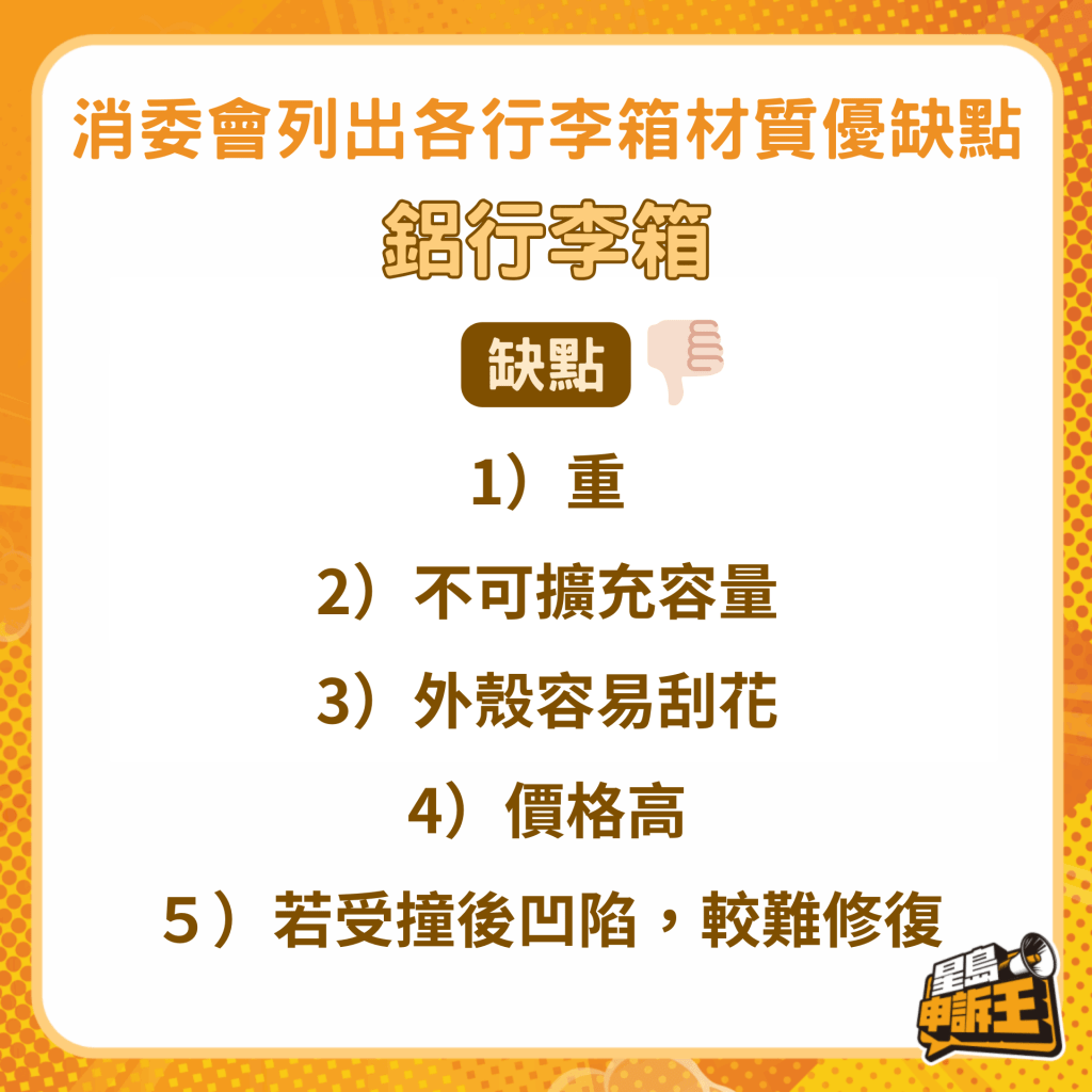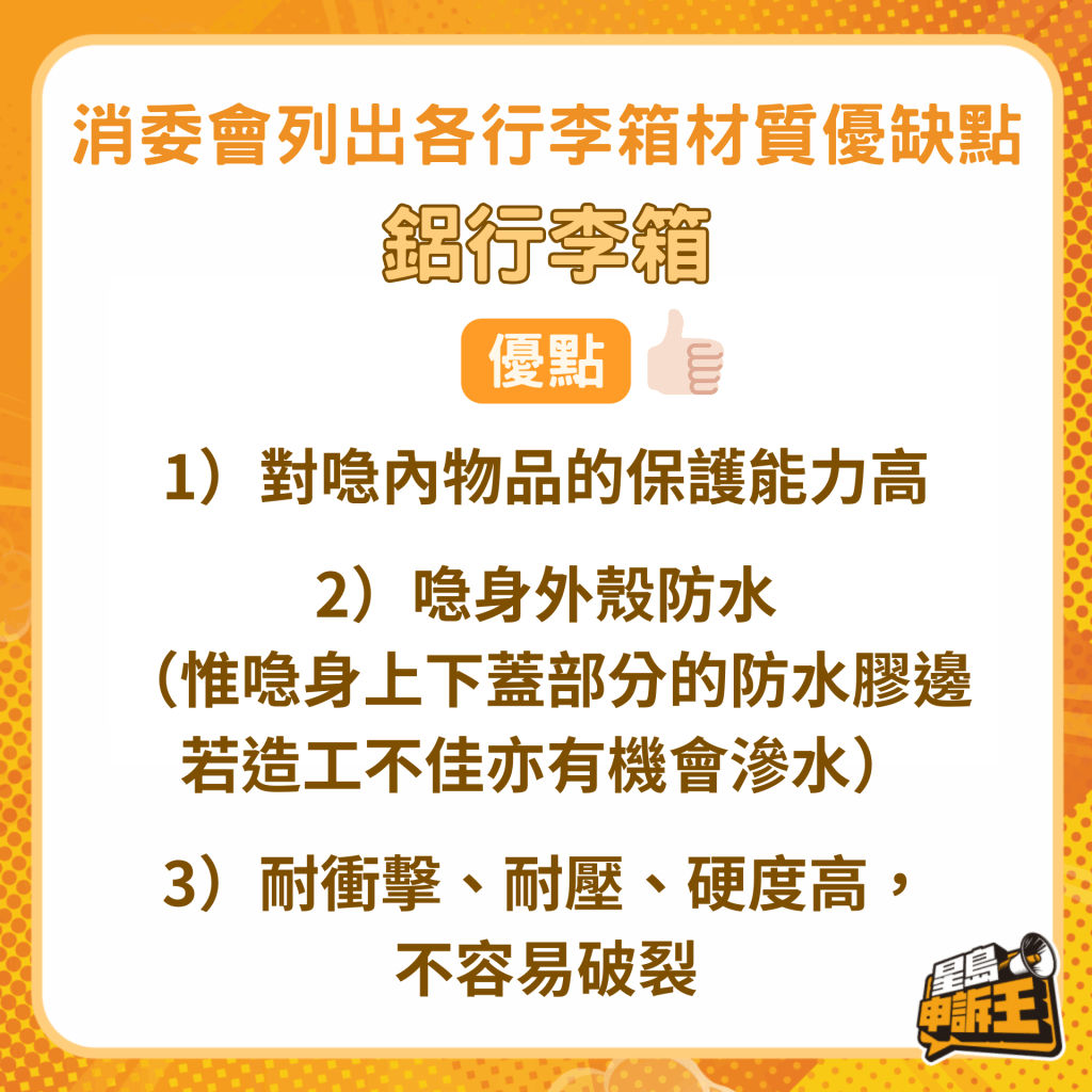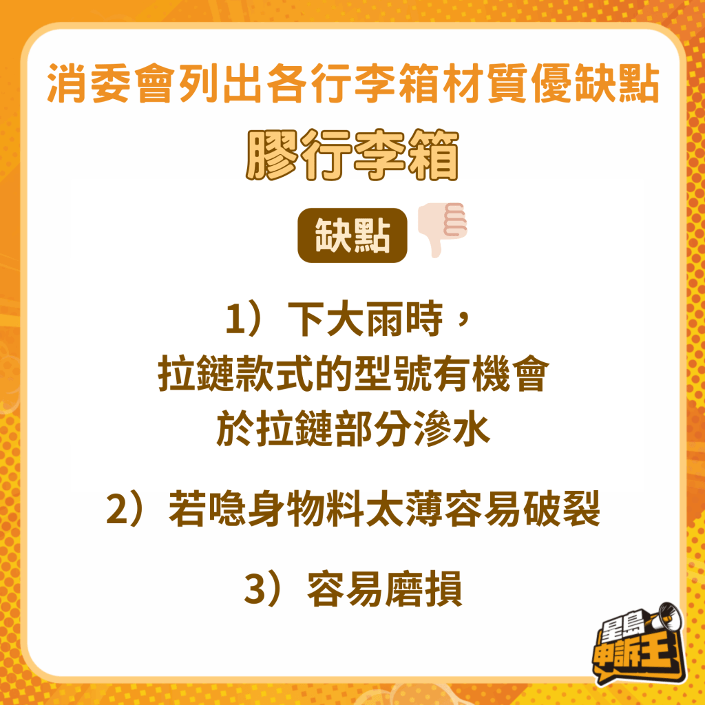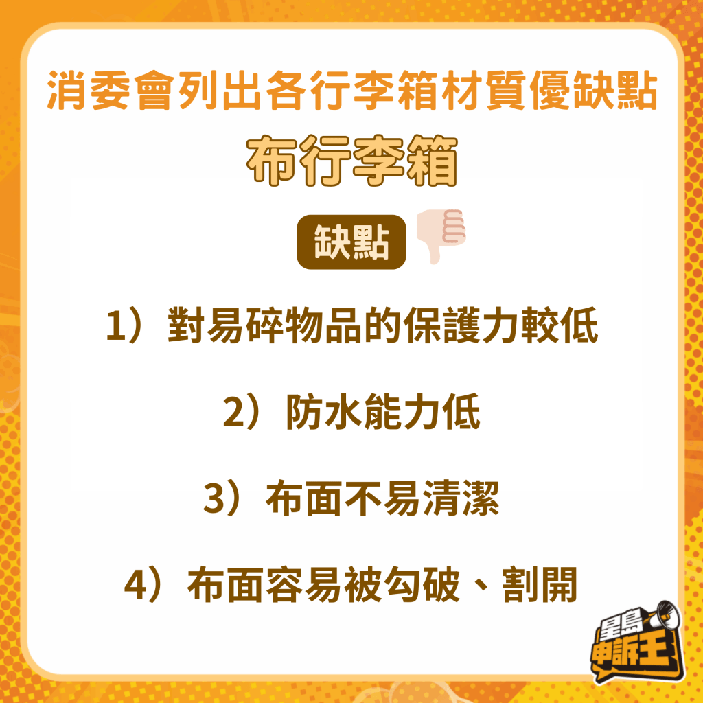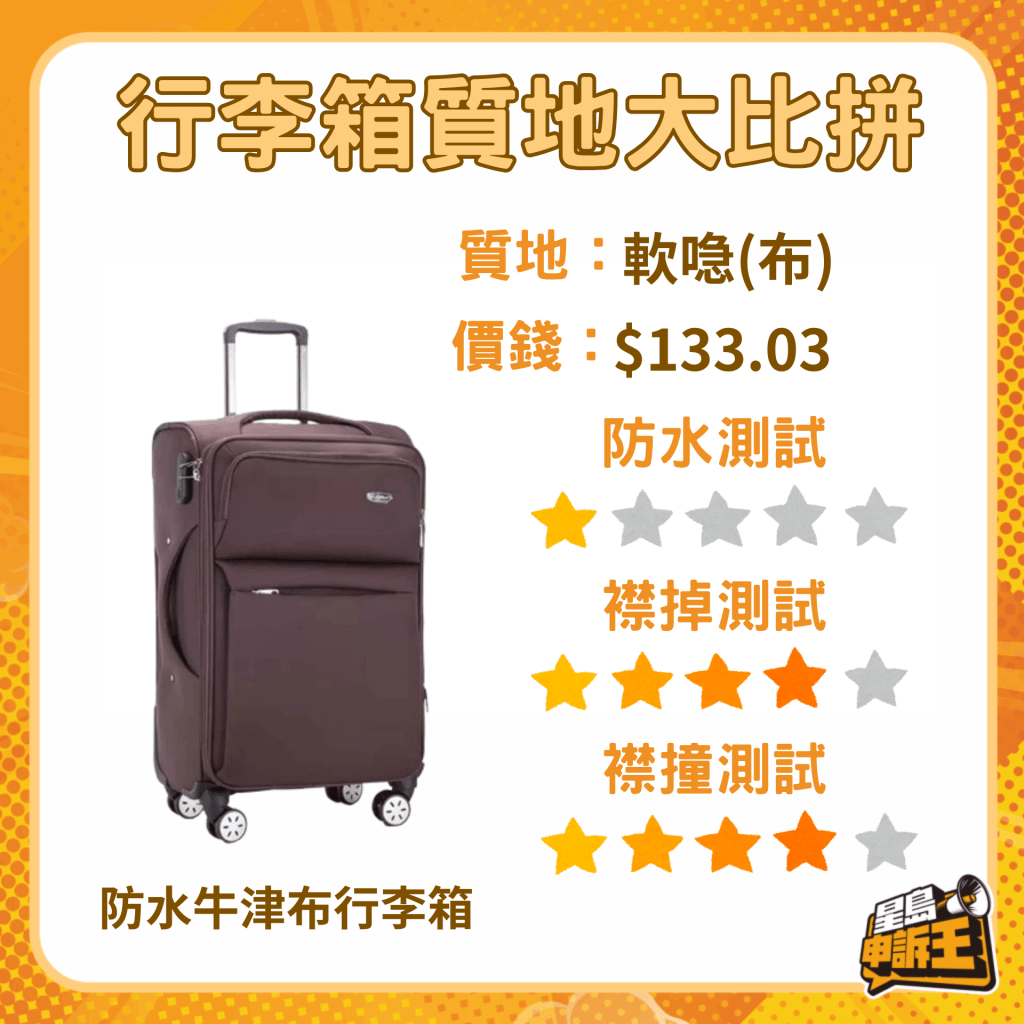 消委會回復《星島申訴王》指,按其去年的測試結果,以塑膠制造的硬行李箱耐跌撞能力較高,布行李箱則需留意其車線位造工,若造工不佳便會在跌撞或擠壓后有爆裂的風險。