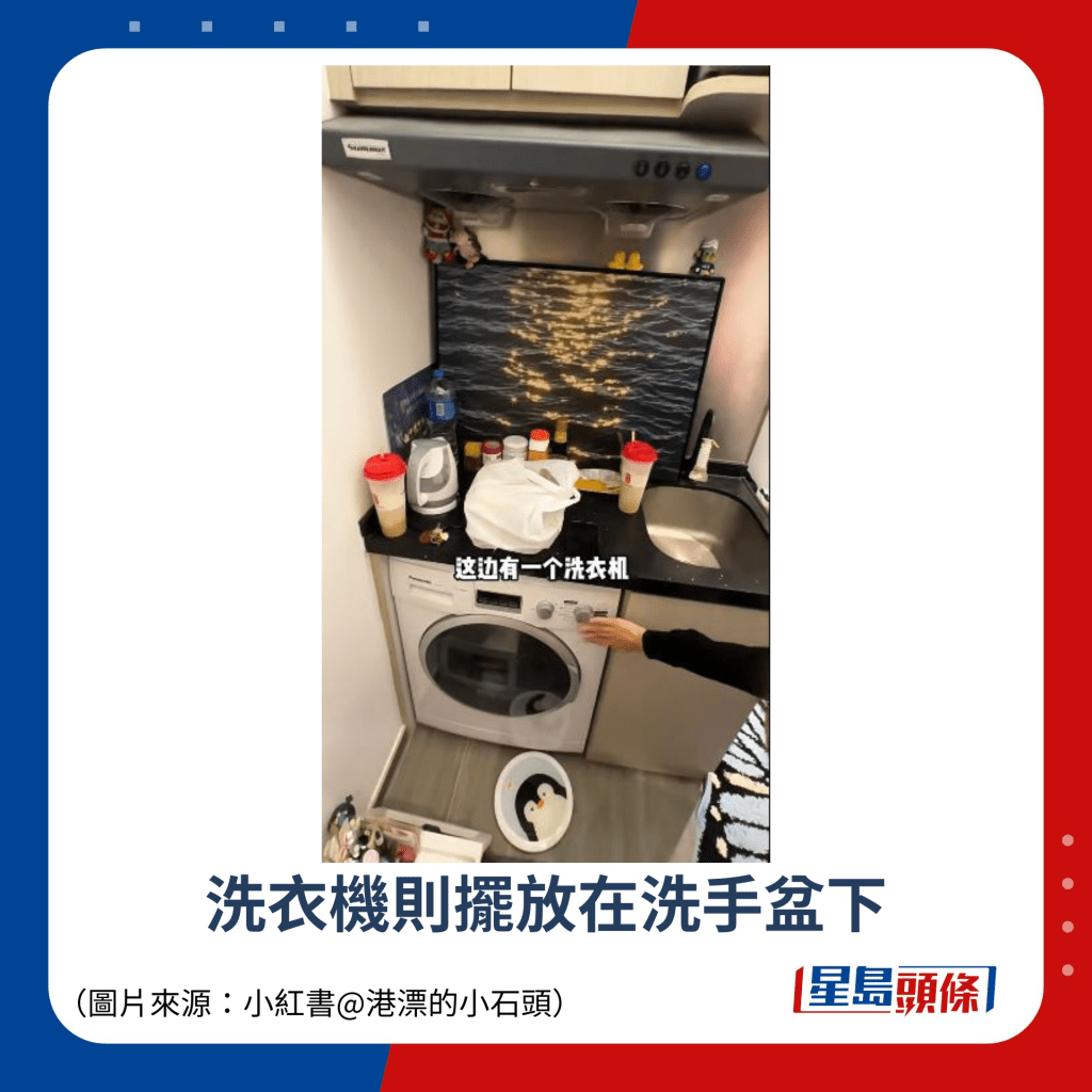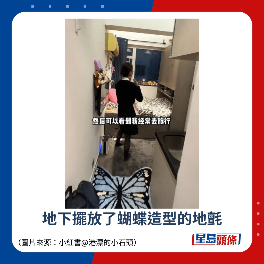 從小紅書片段中所見,事主居住的北角單位大廈大堂企理,有管理員及熒幕顯示閉路電視畫面。月租逾$8000的130呎單位,事主在大門位置放了兩層的鞋架,墻上有幾個掛鉤掛鎖匙與雜物。進入屋內,地下擺放了蝴蝶造型的地氈,突顯住戶品味。單位為開放式單位,窗邊是睡床加組合柜,另一邊是開放式廚房,雪柜放置在廚房柜上方,洗衣機則擺放在洗手盆下。另外,130呎單位更有干濕分離的獨立廁所,可以說是功能齊全的蝸居。