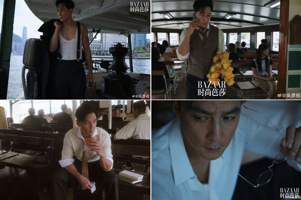 接著,他脫下外套僅穿著白襯衫、將袖子挽起,手臂上的青筋清晰可見,男人味十足。此外,更值得注意的是,其中一張他更直接脫到只剩背心,讓他精壯的身材一覽無遺,整體復古優雅的風格,讓他渾身散發成熟男人的魅力。對此,他透過微博分享拍攝時的心情,表示這次拍攝相當有趣,“因為我以前喜歡搭乘香港的天星小輪。在建造隧道之前,它曾經是往返香港和九龍的唯一方式。天星小輪是逝去時代的最后遺跡之一”。