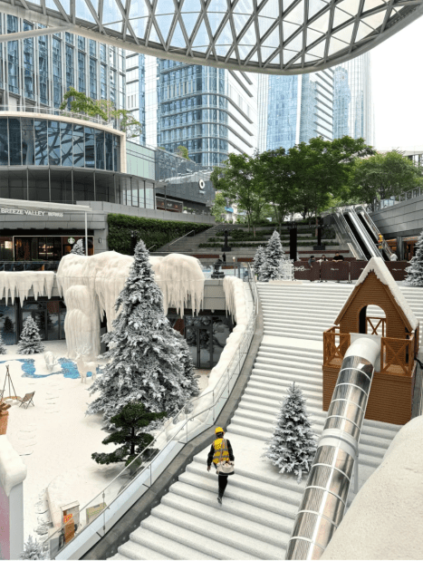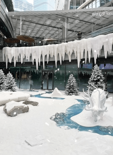 近日,位于深圳南山區的商場“萬象前?!本统饩拶Y吸客,于今個冬天在中庭位置打造面積約1,300平方米的冰雪造景,加入麋鹿、雪兔、雪地露營帳篷、圣誕樹等的裝飾擺設,不定時還會噴灑人造雪,打造飄雪效果,讓賓客猶如置身冬日雪地當中。