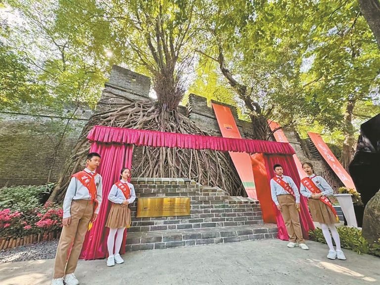沿鎮海路前行,可以欣賞到碩大繁盛、盤根錯節的樹根與城墻融為一體的奇特景觀?!袄蠌V”金溢潮是一名醫生,每天清晨都會沿越秀公園古城墻步行,還寫下了一首名為《墻根緣》的小詩:“根護墻、墻養根,根基相連,長相廝守、相互依存?!比缃?,這首小詩經常出現在越秀公園講解員藍玲玲的講解詞中。