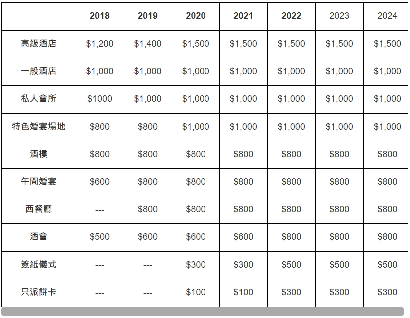 2. 一般酒店、私人會所、特色婚宴場地:維持$1,000