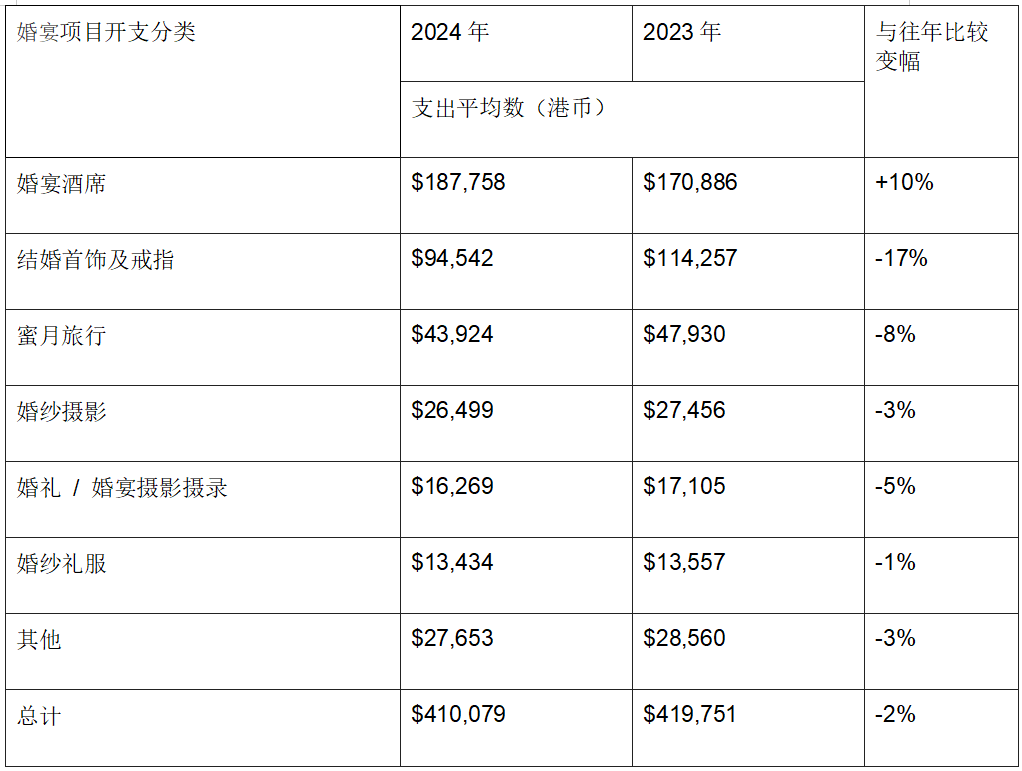 調查指,新人面對經濟環境放緩,在籌劃婚禮時對預算變得更加謹慎,因此今年結婚相關花費亦出現整體下降的趨勢。例如,結婚首飾及戒指的平均開支從2023年的$114,527減少至$94,542元,下降幅度達17%。此外,蜜月旅行、婚紗禮服及婚禮攝影等項目的開支也較去年下降了1%至8%不等。值得注意的是,在所有婚禮開支中,唯獨婚宴酒席的花費卻呈現上升趨勢,從去年的$170,886增至$187,758元,增幅達一成。