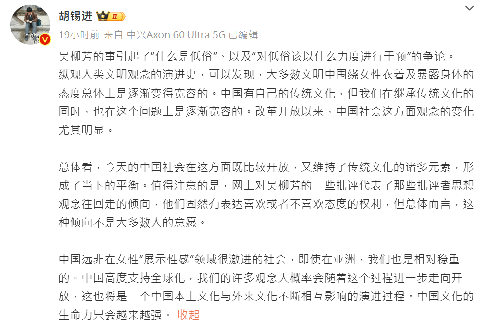 胡錫進表示,他個人不主張對吳柳芳做過重的處理,反對她發那些影片的網民們也不必對她的行為上綱上線,提到“國家榮譽”的高度,一定要推動給她作為退役運動員在轉型路上難以承受的懲罰,大家沒有必要一起把她想要的轉型之路堵死。