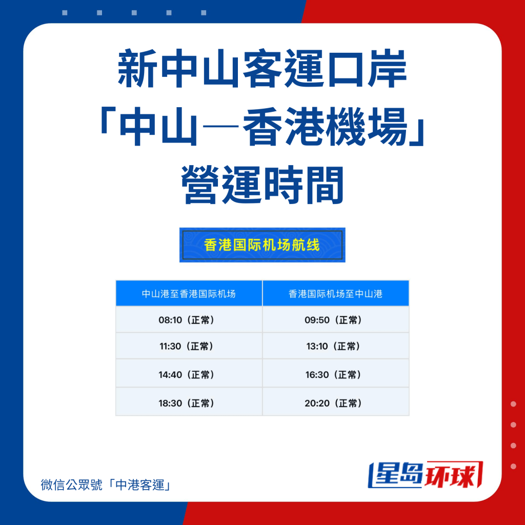 首班船只已于11月28日上午10時開出前往香港中港城,新口岸開通后,將會有3個新航線,包括“中山—香港中港城”、“中山—香港機場”及“中山—深圳蛇口”,計劃每日往返22個航班, 當中香港線有9班來回,而蛇口線則2班來回,也會按需求逐步加密班次。