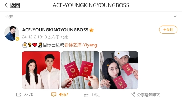 • 黃子韜、徐藝洋領證了!曬結婚照1細節超甜,嗨喊“目標已達成”