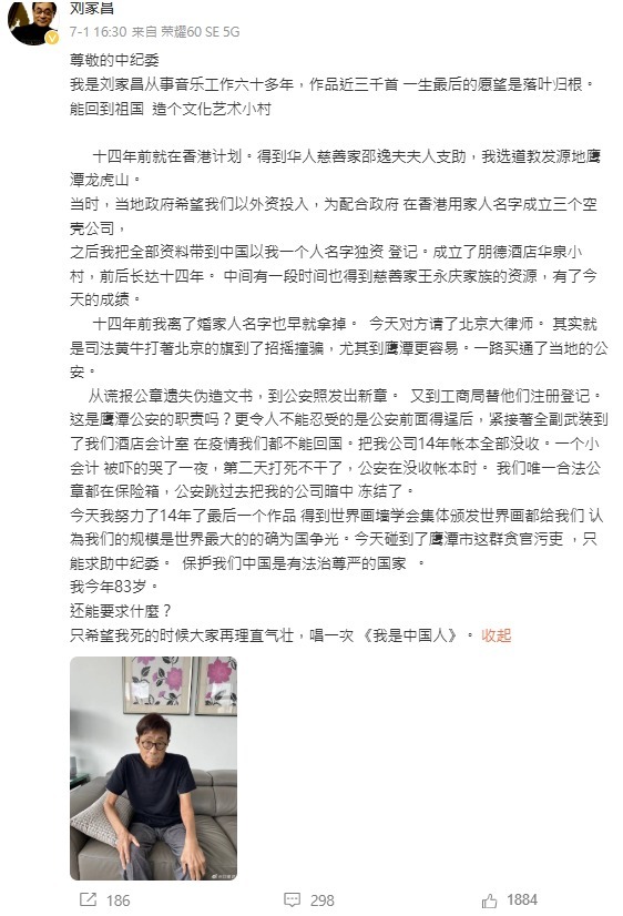 劉家昌今年7月在微博發文全文: