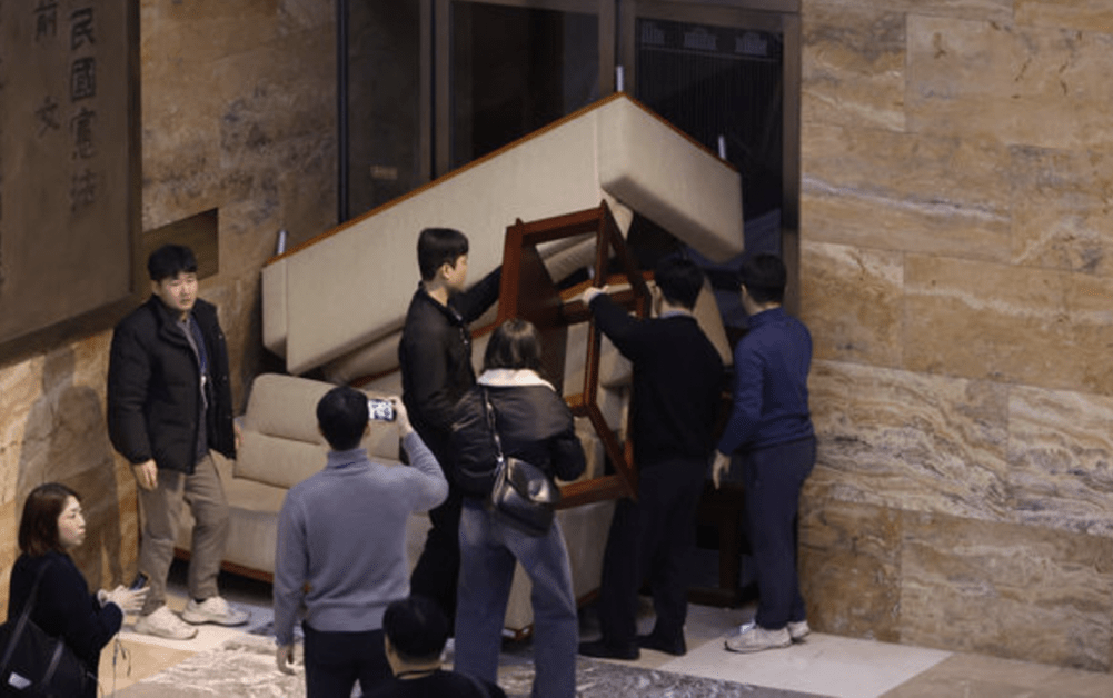 ▲國會議員以椅子擋住國會門戶,阻戒嚴軍進入。 路透社