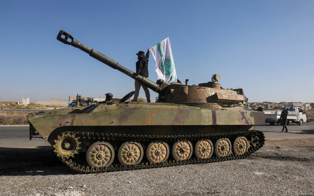 2024年12月1日,敘利亞西北部伊德利卜省一名反抗軍戰士站在一輛軍車上,舉著沙姆解放組織旗幟。(路透社)