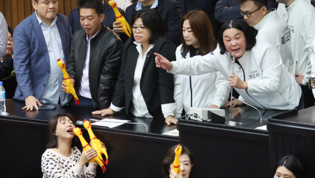 主席臺上爆發藍綠推擠沖突,民進黨“立委”拿出“尖叫雞”,國民黨“立委”陳玉珍(右)諷刺民進黨“立委”沒有論述能力才會拿出道具。