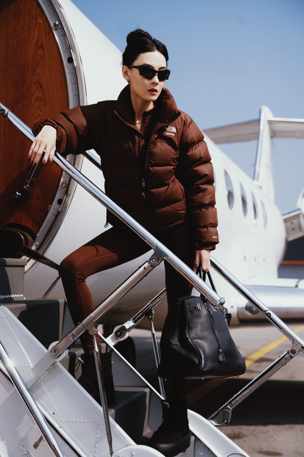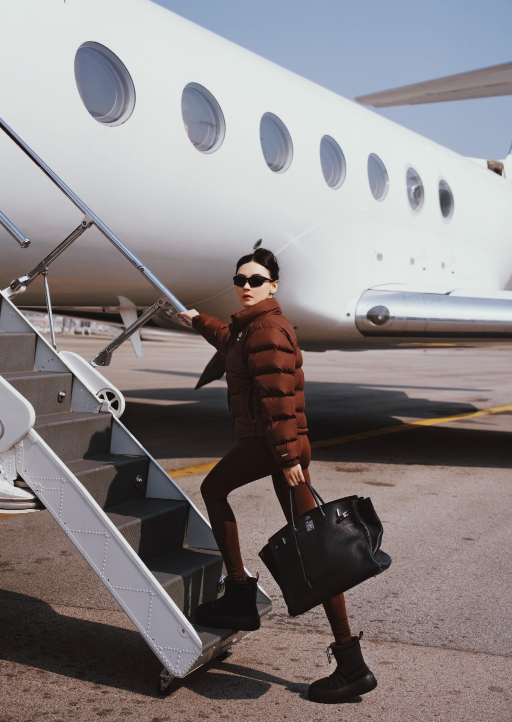 ▲扎起丸子頭的張柏芝身穿一件棕色羽絨服及同色貼身連體衣,再配上黑色短靴及墨鏡,完美地襯托出她的纖幼身形,整體造型既保暖又充滿時尚氣息。