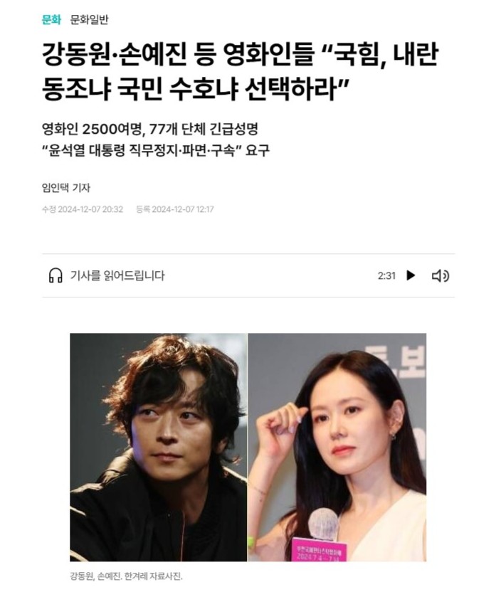 尹錫悅昨日(7日)就事件鞠躬道歉,國會于當地時間昨日下午5時正式召開彈劾案,最終在執政國民力量黨表明反對彈劾案集體離場后,尹錫悅彈劾案在票數不足的情況下未能通過。而日前傳出電影界的聯合聲明中,曾提到名導奉俊昊、姜棟元、孫藝珍、全智賢、金高恩等知名演員也有發聲,今日卻峰迴路轉,有韓媒報道聯署名單的演員僅同名同姓,與大眾認知上的演員毫無關系。