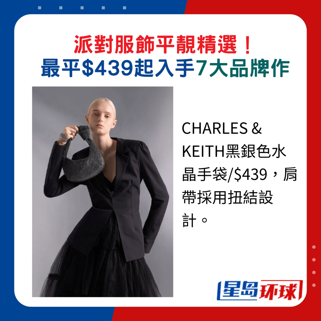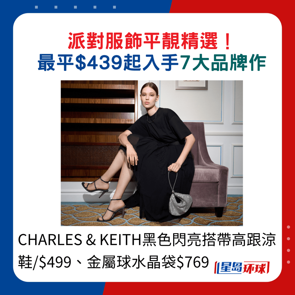 想為派對造型加分?! 選對配飾相當重要,Bling Bling閃亮設計最是迎合節日色彩。CHARLES & KEITH夢幻節慶系列包羅各款手袋及鞋履,以經典的黑、 銀、粉紅及金色為主調,統統用上水 晶、閃亮元素及金屬光物料裝飾,華麗感十足。 其中一款水晶手袋,肩帶綴以金屬球裝飾,亦可將肩帶放入金屬球當成手挽,靈活配襯不同派對造型。 小資女熱捧的香港鞋履The Korner,也有亮麗選擇,一款絲絨制平底鞋,綴以立體的繡珠裝飾,典雅又高貴。