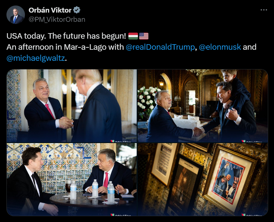 報道稱,歐爾班9日在社交媒體X上發帖:“今天(的)美國。未來已經開始!與特朗普、馬斯克和邁克·沃爾茨(被特朗普任命為美國國家安全顧問——編者注)在海湖莊園的一個下午?!?/p>
