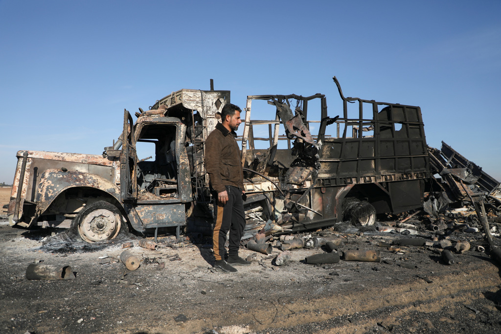 2024年12月10日,區域安全消息人士和原敘利亞軍隊內部官員表示,以色列連夜持續對敘利亞各地的軍事設施和空軍基地進行空襲,一名男子在 卡米什利國際機場附近檢視一輛燒毀的卡車。路透社