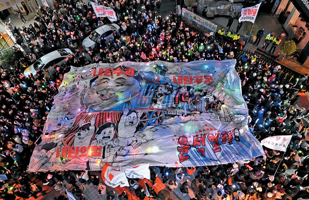 ▲首爾示威者在執政國民力量黨總部外舉行“彈劾燭光集會”,展示諷刺總統尹錫悅的漫畫。