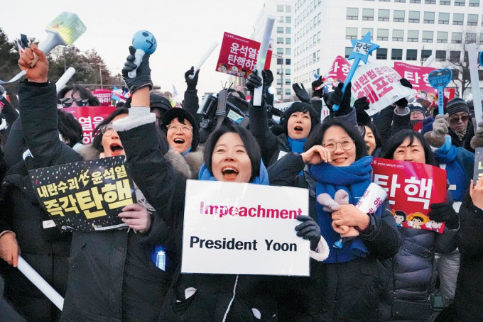 在國會外集會的民眾,周六知悉國會通過總統尹錫悅的彈劾案后歡呼雀躍。