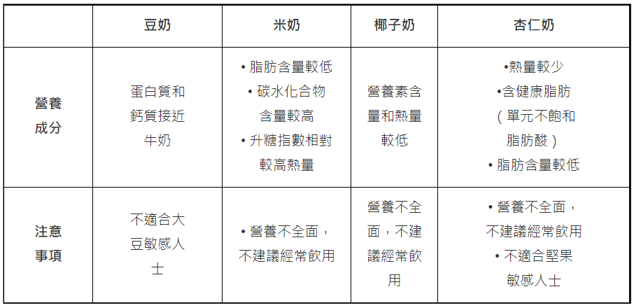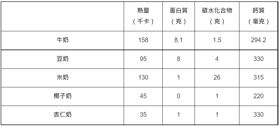 豆奶的蛋白質成分和牛奶相若,一杯240毫升就含有七至八克蛋白質。相比之下,米奶、椰子奶和杏仁奶的蛋白質含量較低,是牛奶的1/8或更少。在鈣質方面,大部分植物奶都添加了鈣質,含量與牛奶不相上下,一杯約含有300毫克鈣;至于碳水化合物方面,一杯牛奶的碳水化合物含量約為12克,而米奶則高達26克,相當于半碗白飯的碳水化合物。杏仁奶的碳水化合物含量和熱量在各種奶類中都是最低的。一般有口味的牛奶飲品(如朱古力、木瓜和香蕉等)會添加額外的糖分,令碳水化合物含量再提高,選購時要多留意營養標簽上的糖分含量!建議這類高糖奶類只可當作happy food,而四歲或以下的幼童最好每日飲用不多于100毫升。