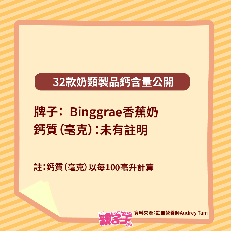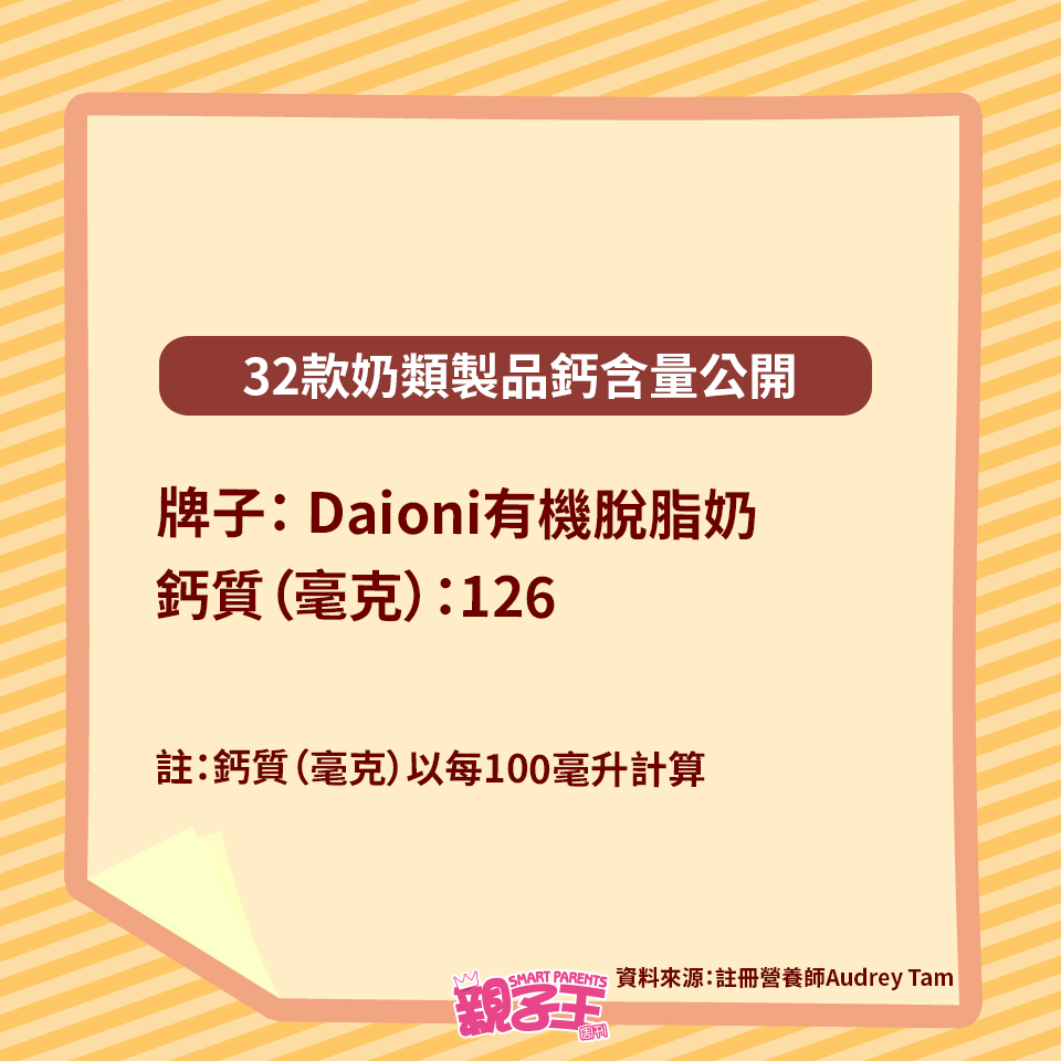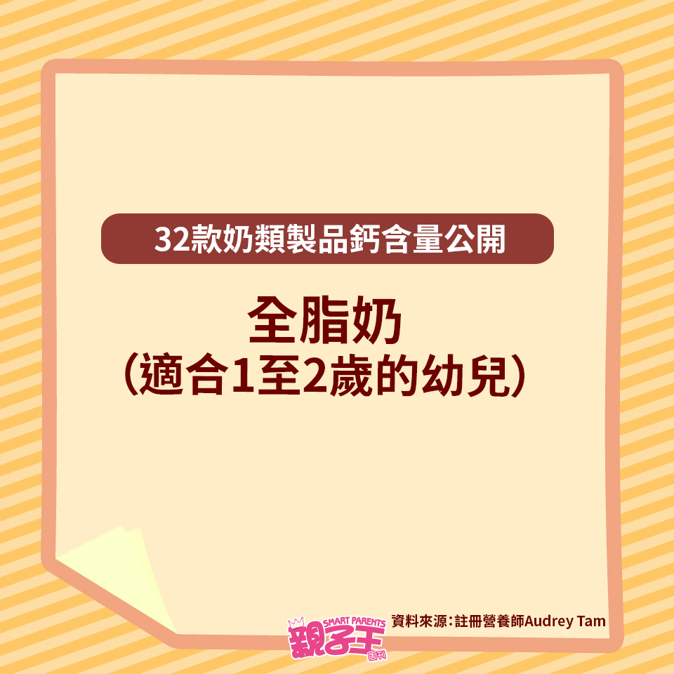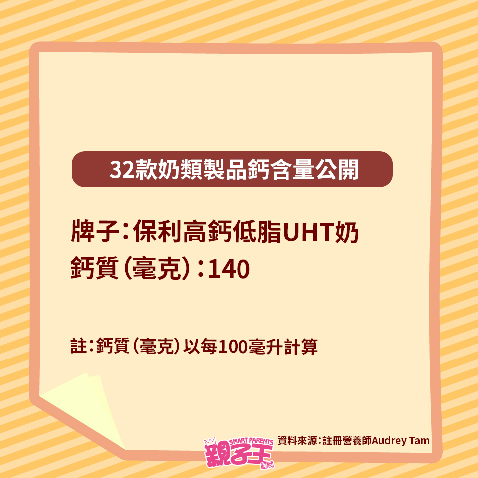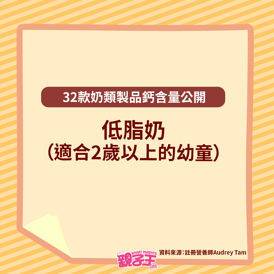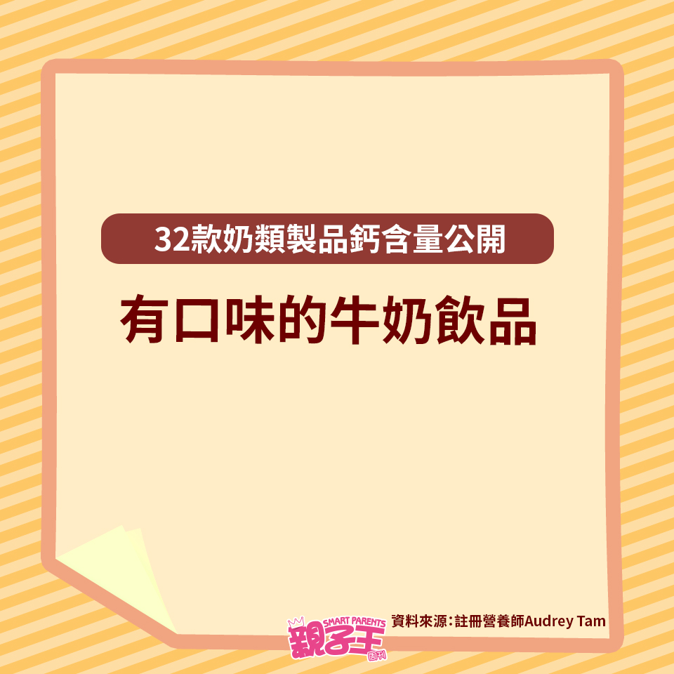 選牛奶或牛奶飲品首先要了解其營養價值,以鈣質為主(有口味的牛奶飲品還需要留意糖分含量)。以十字牌和維記的奶類為例,一盒236毫升的高鈣牛奶飲品含401毫克鈣質,較鮮奶的260毫克多約50%。以四至六歲兒童每日需要800毫克鈣質計算,飲用兩杯高鈣牛奶飲品已滿足到建議攝取量。而鈣含量較低的某日本100%鮮奶,每100毫升含94毫克鈣質,飲用一盒236毫升只攝取221毫克鈣。另外,有部分卻未有在營養標簽上注明鈣質含量,包括Binggrae香蕉奶、大阿蘇云拿呢拿牛乳和旺仔奶類飲品等。