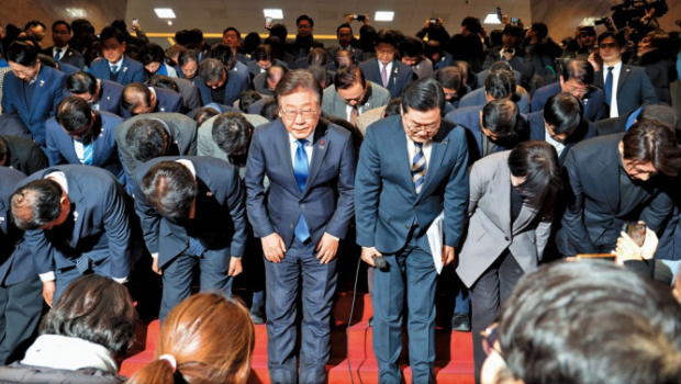 ▲國會上周六通過彈劾總統動議后,反對黨共同民主黨黨魁李在明(中)與該黨議員一起鞠躬。