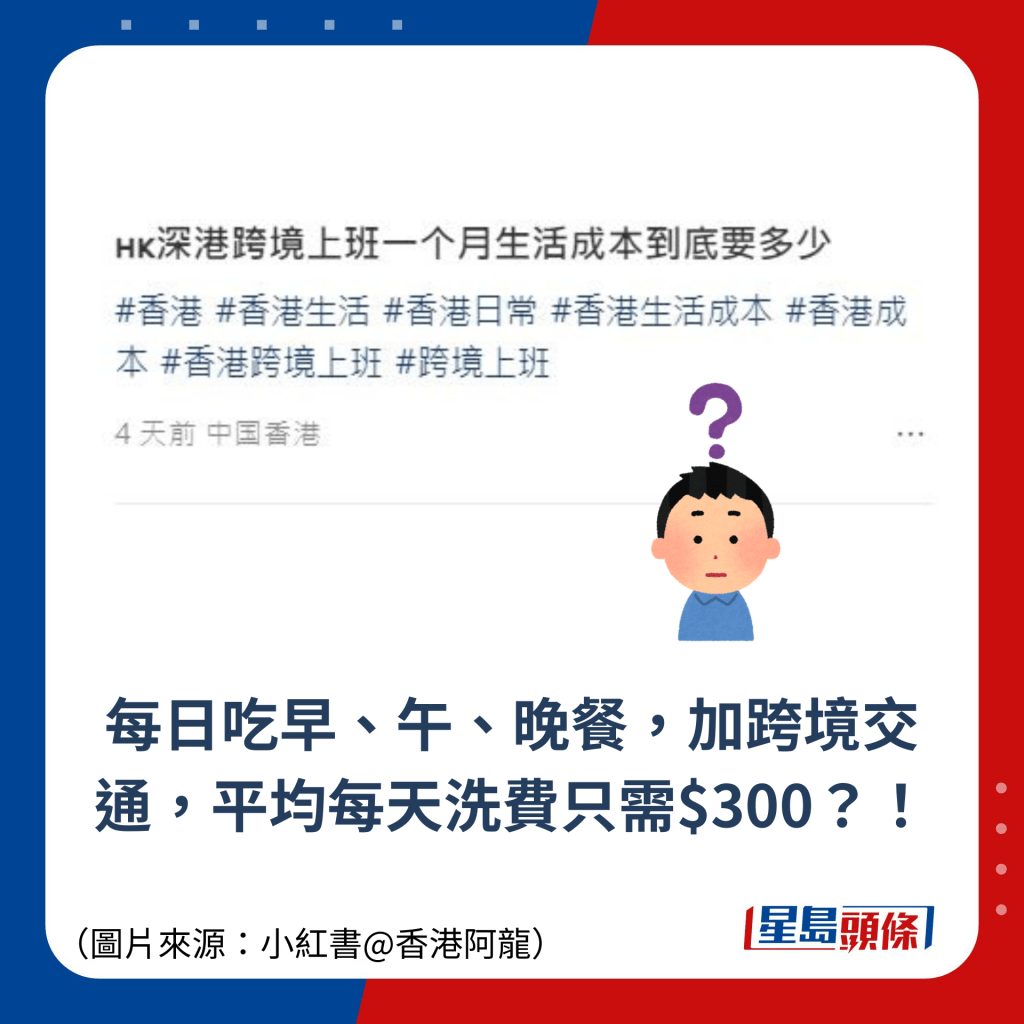 香港樓價租金昂貴,近年越來越多人選擇北上置業或租樓,到底每日跨境到香港工作真的更劃算嗎?日前,就有一位香港男子在小紅書將深圳香港跨境上班的生活成本公開,每日早、午、晚餐,連同跨境交通費,平均每天洗費只需$300內!